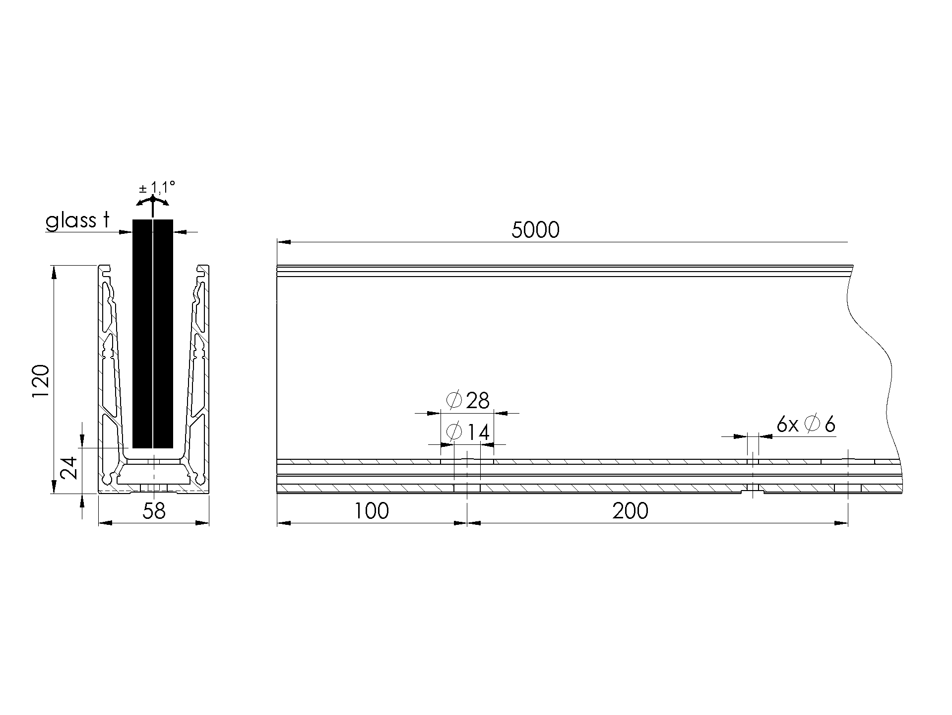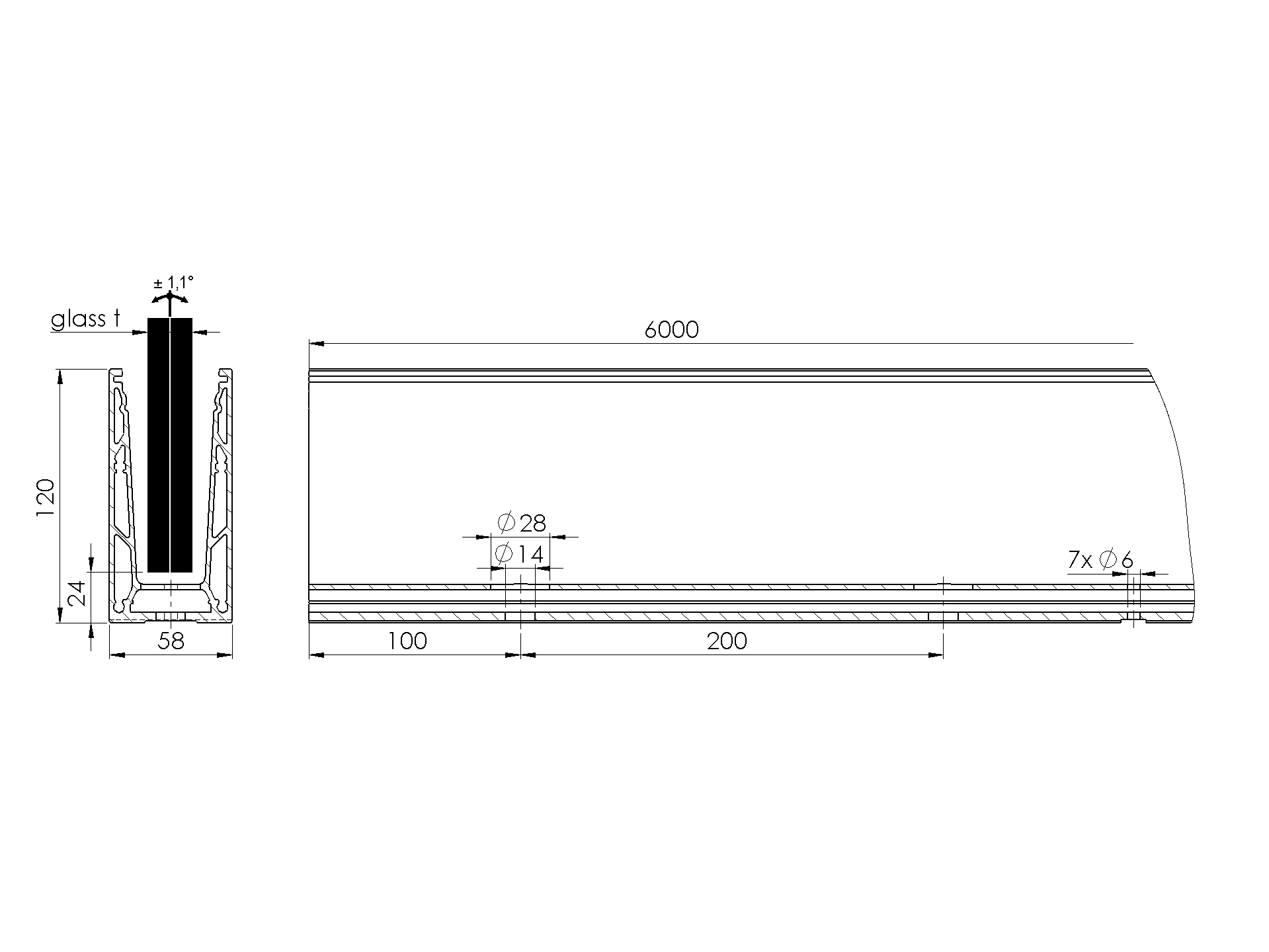 Celosklenené zábradlie-profil dutý-vrchné kotvenie AL/0004-LIGHT-6000-S-E