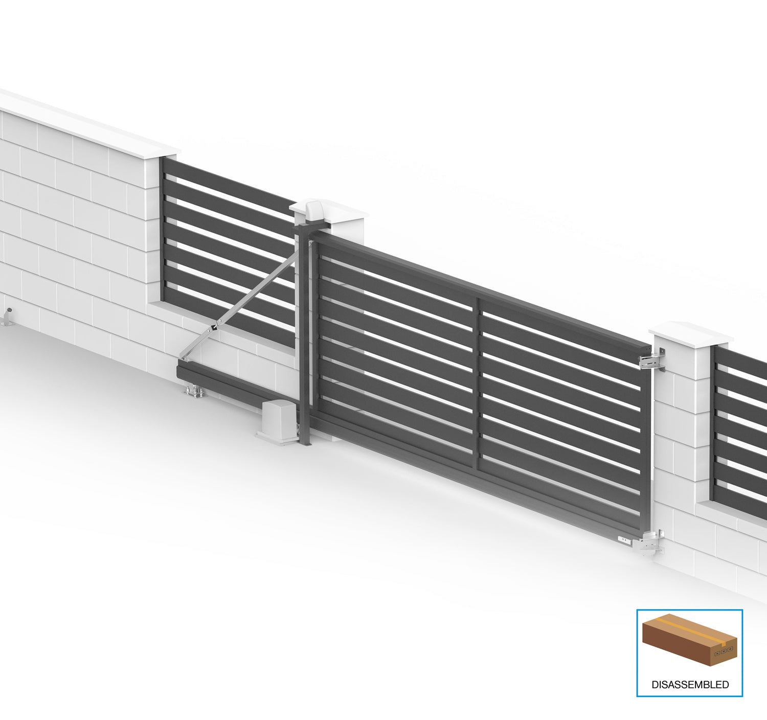 The self-supporting sliding gate is delivered as an assembly set in a disassembled state. It is designed for quick and easy installation without the need for welding. You can find the list of components included in the set in the Parts section. The set does not include anchoring material. The precisely designed assembly system ensures that the gate will be firm and stable while maintaining its attractive appearance.