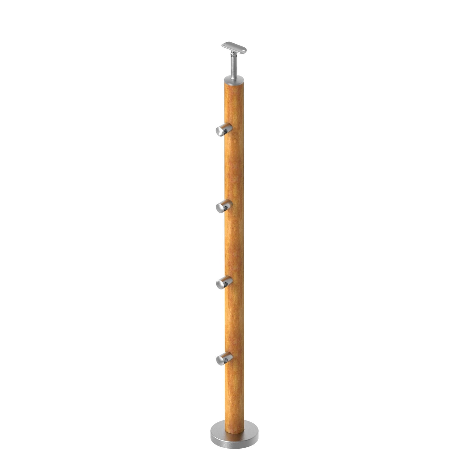 Wooden post D50mm for handrail D42.4mm, top mounting horizontal filling 4 x d12 mm. Designed for staircase railing height 90 cm, for installation with a maximum overhang up to 3 m. Possibility to adjust the slope of the filling and handrail. Stainless steel components with brushed surface finish.