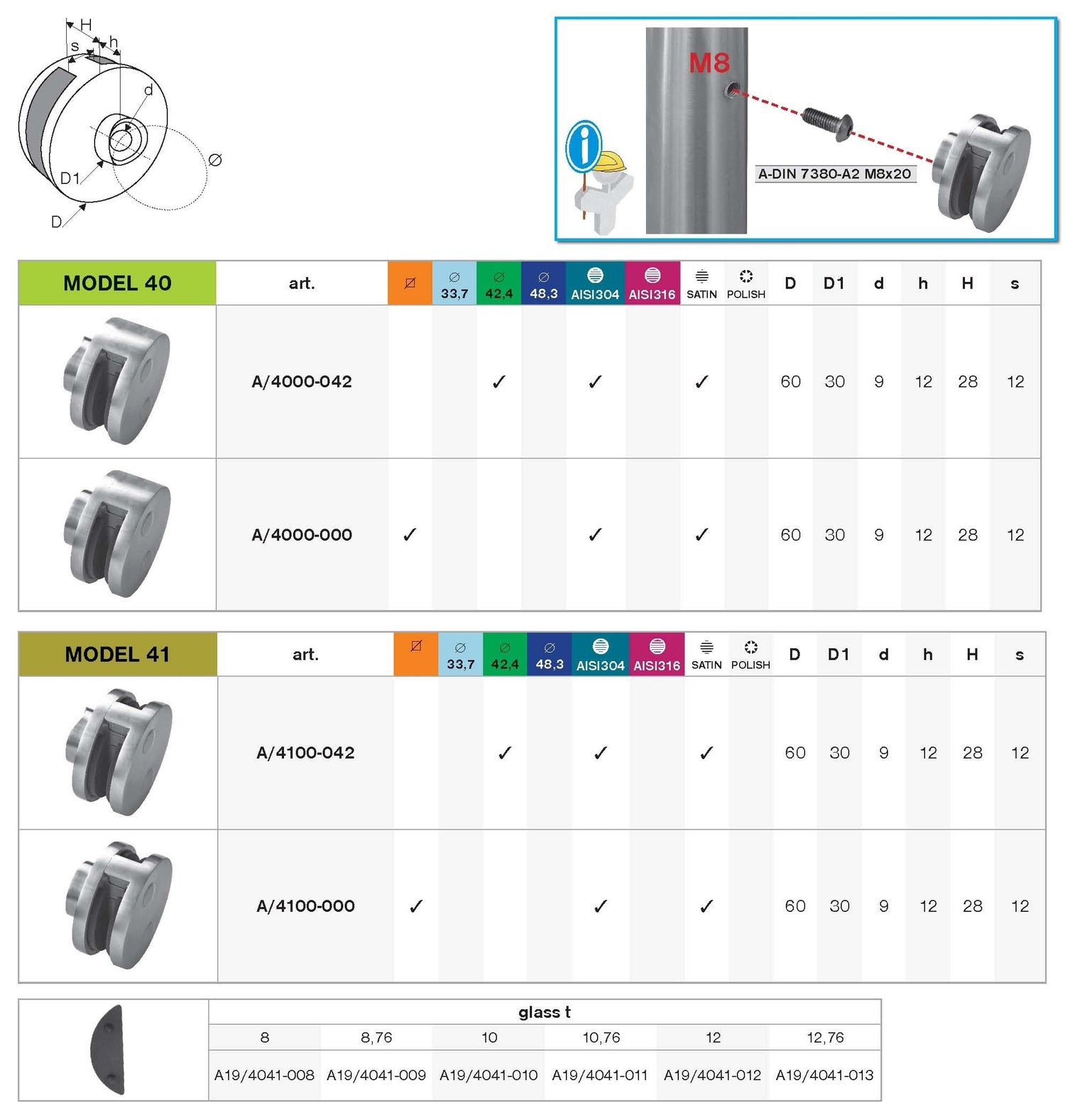 Material: Stainless steel AISI 304, Surface finish: Satined, Filling: Glass, Glass t: 8/8,76/10/10,76/11,52/12/12,76, Post: D42,4, Model: Model 40, 41
