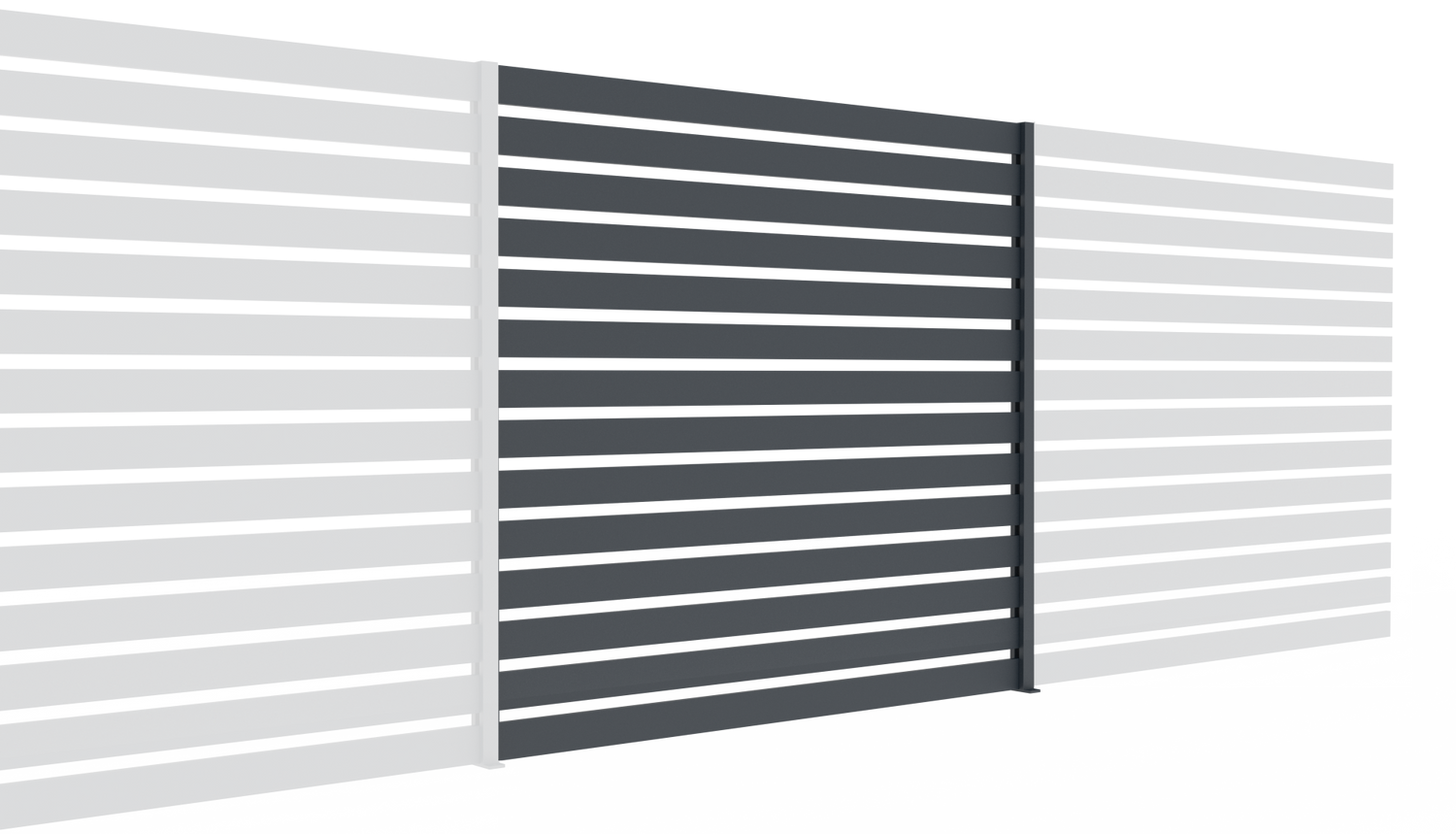 The 1850mm high and 2000mm wide assembly consists of 20x100mm aluminium slats and a PRO70x70 post. This modern design offers a balance between privacy and openness, allowing light and air to pass through, while the assembly maintains a sense of security and elegance. An ideal solution for the exterior of homes, gardens or commercial spaces.