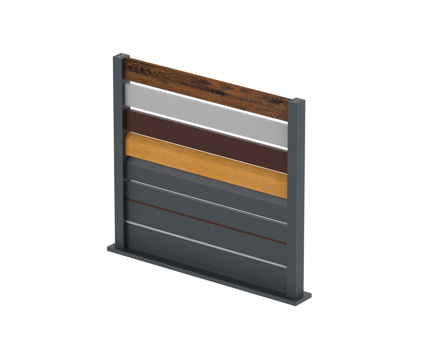 Ta próbka ogrodzenia jest wykonana z różnych rodzajów aluminiowych lameli, co zapewnia ich lekkość, odporność na warunki atmosferyczne i długą żywotność. Wymiary próbki to 1 m × 0,9 m, co umożliwia łatwą manipulację i przejrzystą prezentację produktów. Próbka zawiera słupki FG/P50×60. Lamele są równomiernie rozmieszczone i mogą być dostępne w różnych wzorach, kolorach i wykończeniach powierzchni.