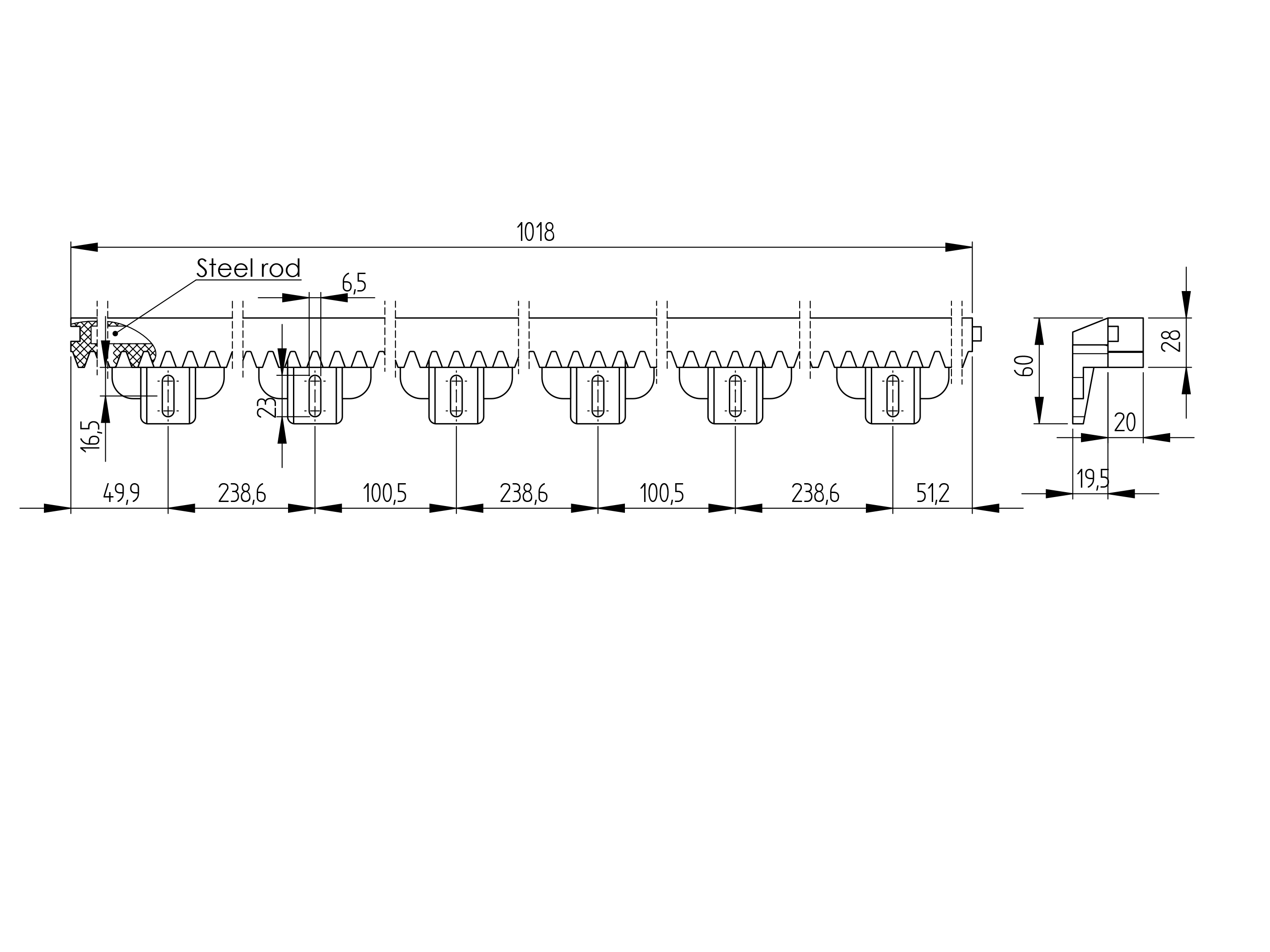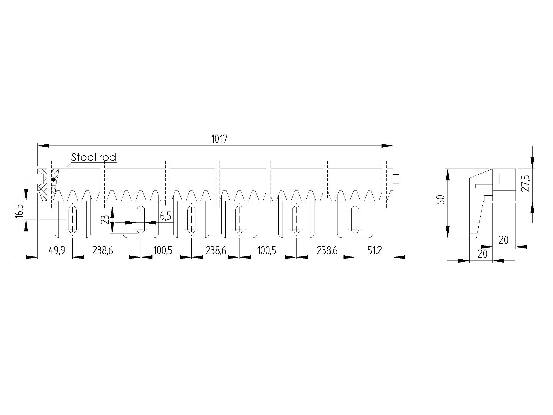 1 szt.MateriałStalWykończenie powierzchniOcynkowanyListwa zębata PVC+Fe,27x20mm,L1m,max 1200kg H/01PVC-S-BS