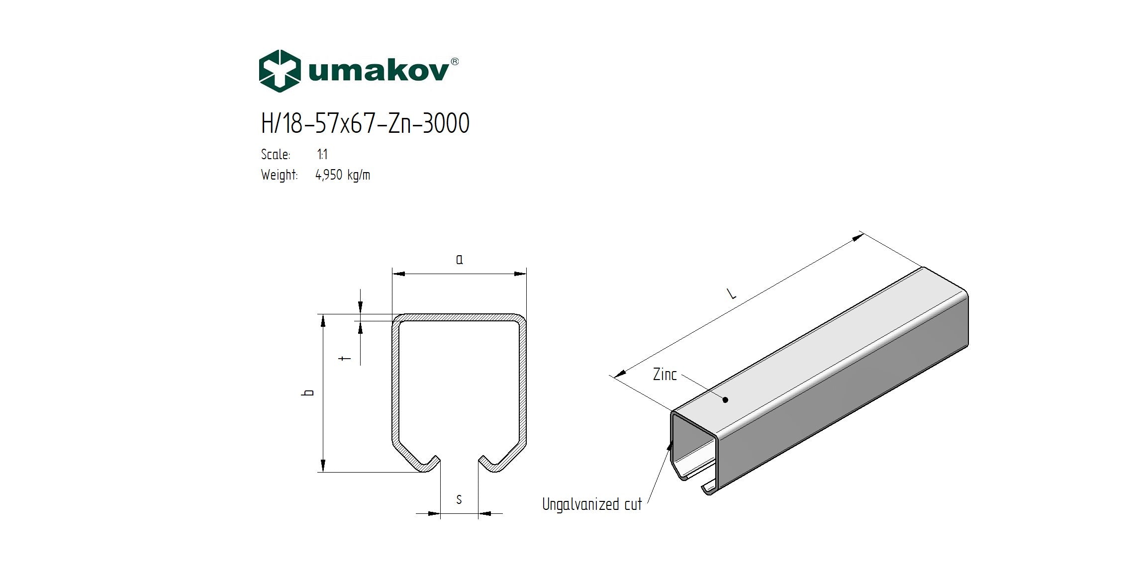 Profil do bramy przesuwnej Zn, 57x67x3mm, L6m H/18-57x67-Zn-6000