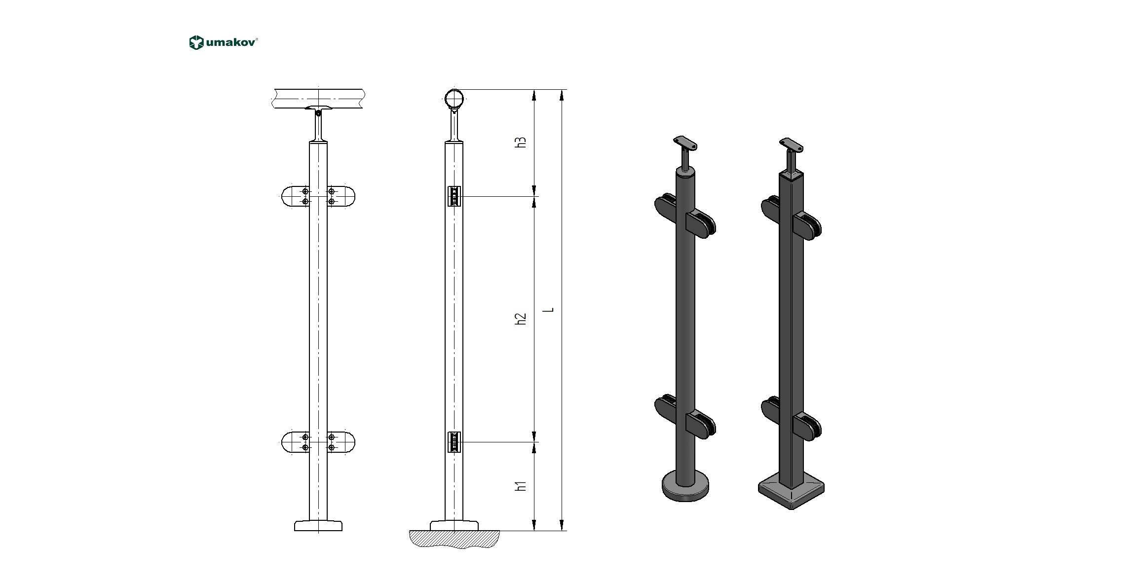 Słupek dębowy Fi 42,4 mm. 4x uchwyt słzka, h=100cm WD-VS100-4G