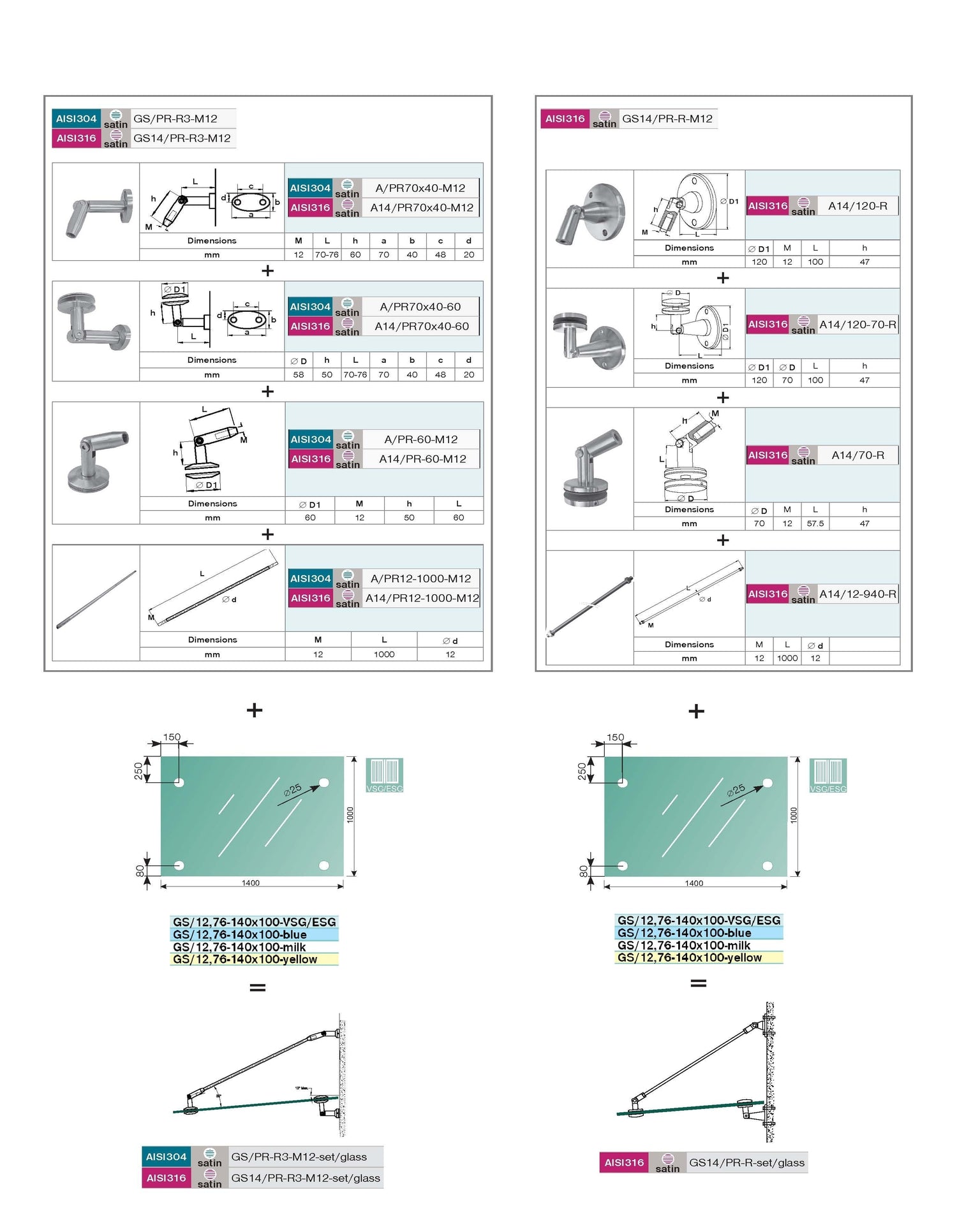 Daszek nierdzewny- okucia kpl M12 + szkło AISI316, GS14/PR-R3-M12-set-1400-M