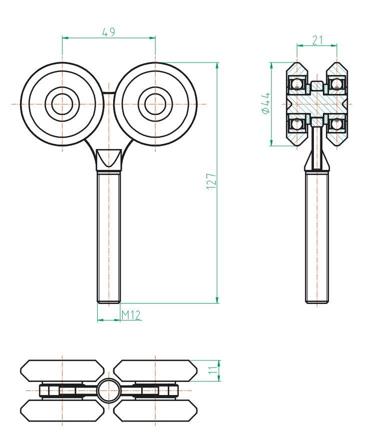 4 - rolkowy wózek ze sworzniem do szyny Zn, profil H/08-42x54-NYLON