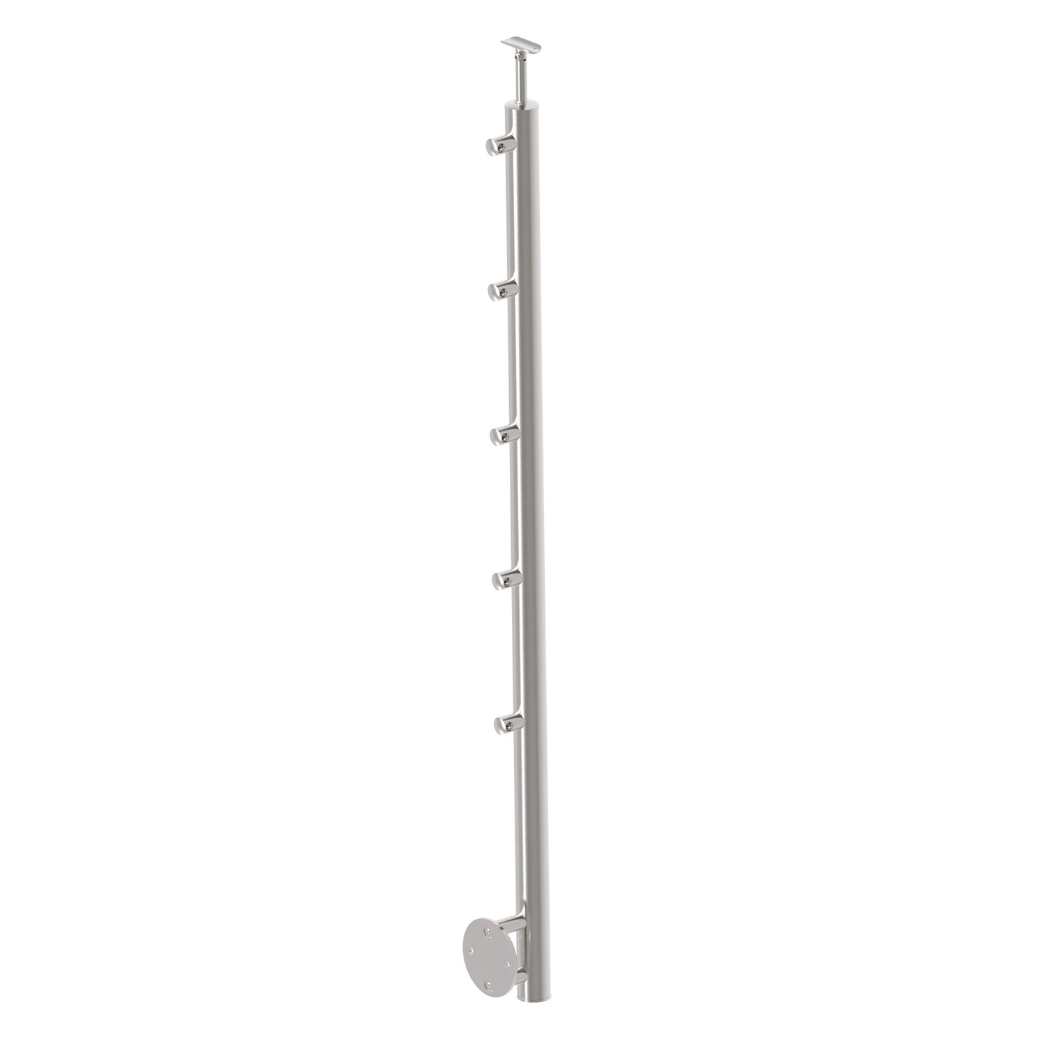 Nerezový stĺpik D42,4 mm pre madlo D42,4 mm. Bočné kotvenie, horizontálna výplň 5 x d12 mm. Určené pre schodiskové zábradlie výšky 100 cm, pre montáž s max. prepadom do 12 m. Možnosť nastavenia sklonu výplne a madla.